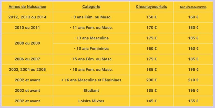 A partir de la 2ème licence par famille, vous bénéficiez d’une remise de 40€ (réservé au chesnaycourtois). Exemple : 2 licences en tout = 40€ de réduction, 3 licences en tout = 80€, 4 licences en tout = 120€, etc…