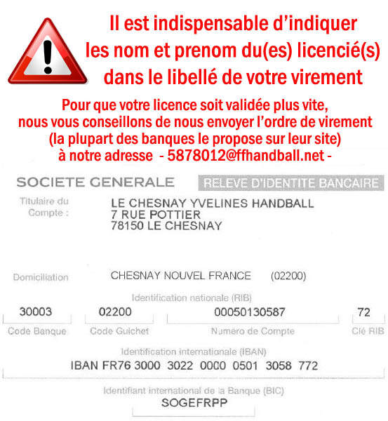 Chèque, à l’ordre du Chesnay 78 Handball. Merci de déposer celui-ci, sous enveloppe mentionnant « Inscriptions handball », à notre bureau ou à la direction des sports au gymnase Nouvelle-France
